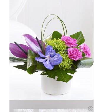 A cool colour palate has inspired this immaculate designer arrangement. The glossy purple anthurium and ornamental blue Vanda orchid are truly stunning and really draw the eye into this lavish display.