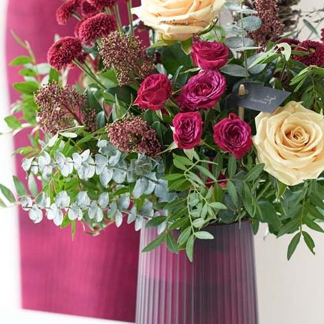 Make sure they don't lift a finger with season with gorgeous blooms already shown off beautifully in a handblown vase. It'll feature blooms in rich red and green shades, with peach and cream highlights and pops of burgundy and cerise.