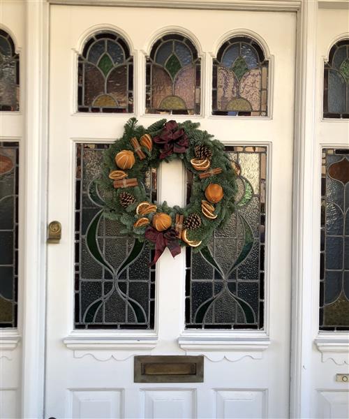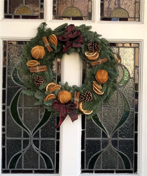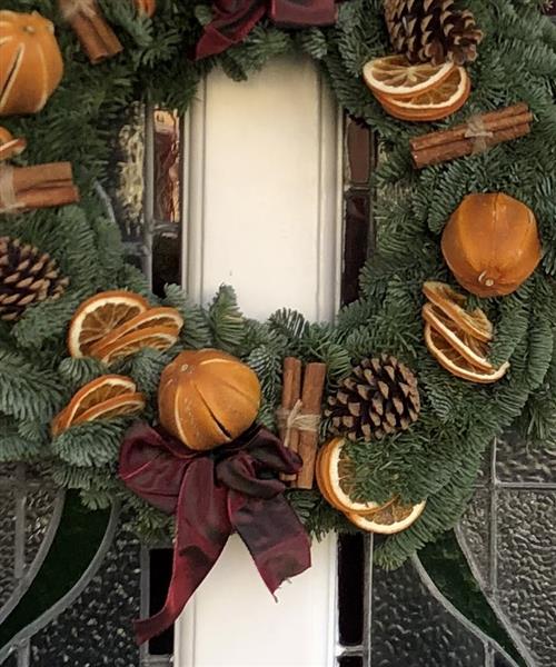 A blue pine door wreath with dried Orange Slices, Cinnamon Twigs, a nice red bow