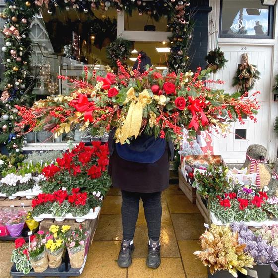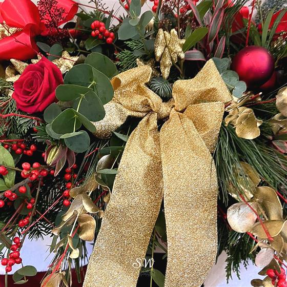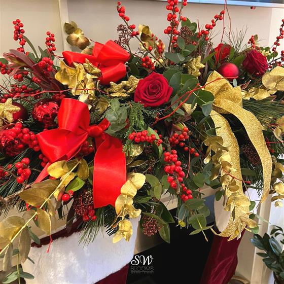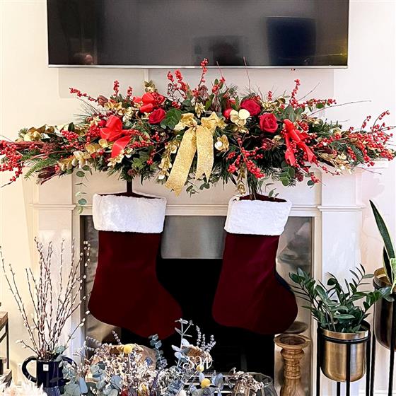 Introducing our Front-Facing Fireplace Christmas Arrangement, a captivating centrepiece designed to elevate your festive décor. Adorned with vibrant red flowers and glistening golden accessories, this exquisite creation adds warmth and elegance to your holiday setting.