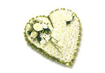 A classic heart-shaped design with Green ribbon edge covered with a mass of white double spray chysanthemums and finished with a spray of White large-headed roses, and ruscus.