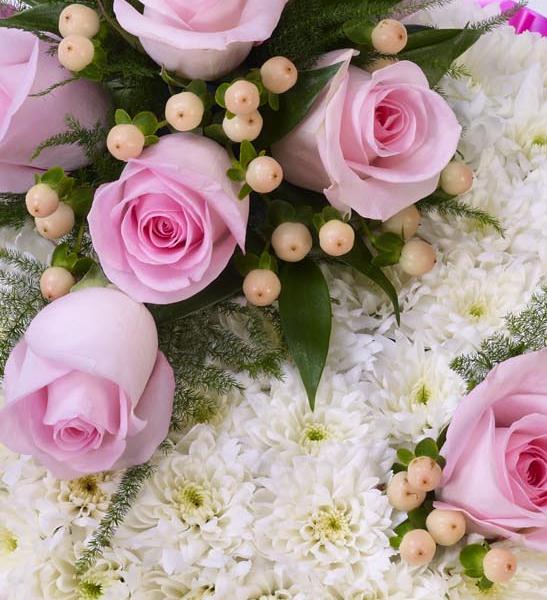A classic posy design created using a mass of white double spray chrysanthemums and completed with a spray of pink roses, French ruscus and hypericum berries.