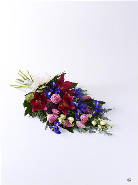 The soft blue shades of iris are complemented by pink Oriental liles, pink large-headed roses and cream lisianthus in this classic sheaf, which is tied together with a cream ribbon.