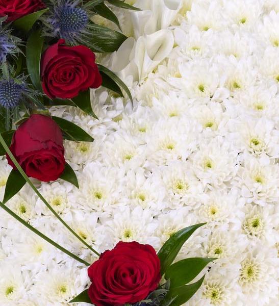 A classic heart-shaped design with White ribbon edge, covered with a mass of white double spray chysanthemums and finished with a spray of red large-headed roses, eryngium and ruscus.