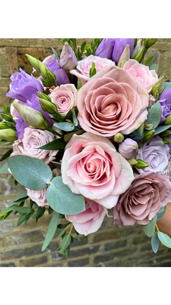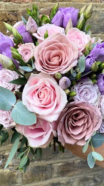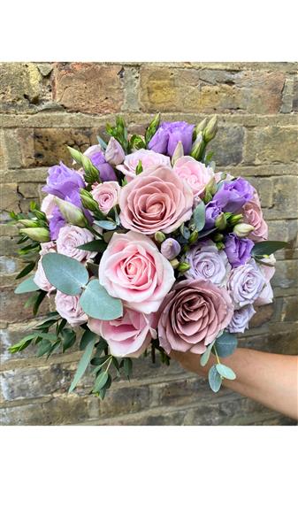 A beautiful & colourful bridal bouquet with flowers consisting of Pink & Purple Roses, Lisianthus & Amnesia Roses.