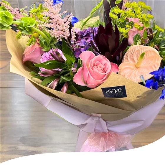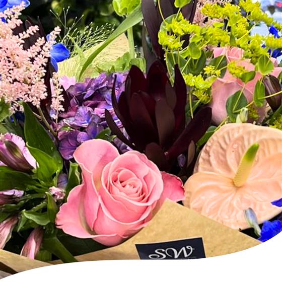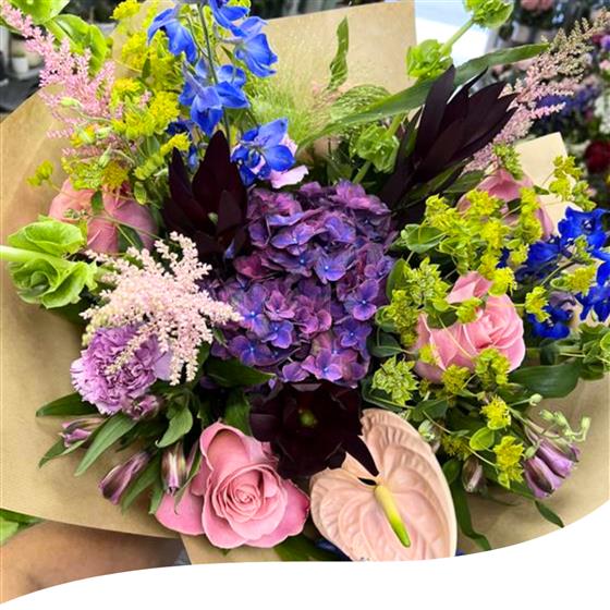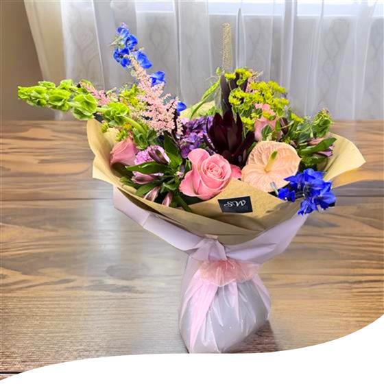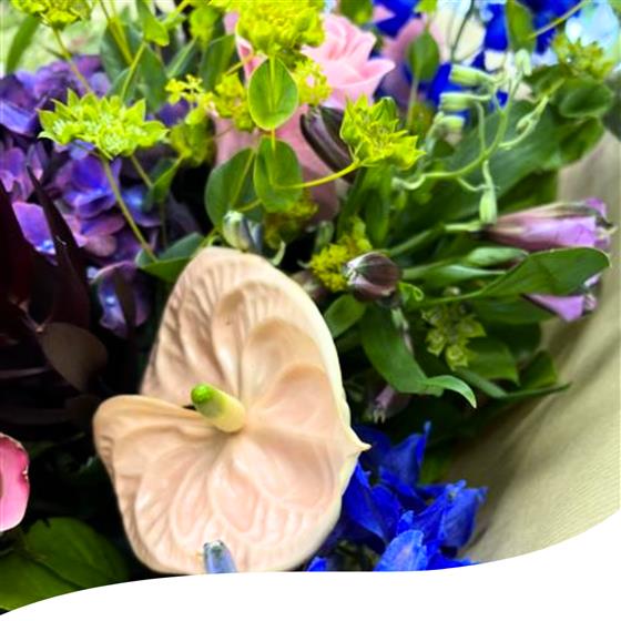 Introducing our vibrant Colourful Summer Bouquet! This beautiful arrangement is overflowing with the beauty of the season and features a variety of summer blossoms. From captivating Blue Delphiniums to exotic Pink Anthuriums, each flower is thoughtfully chosen to capture the essence of summer joy.