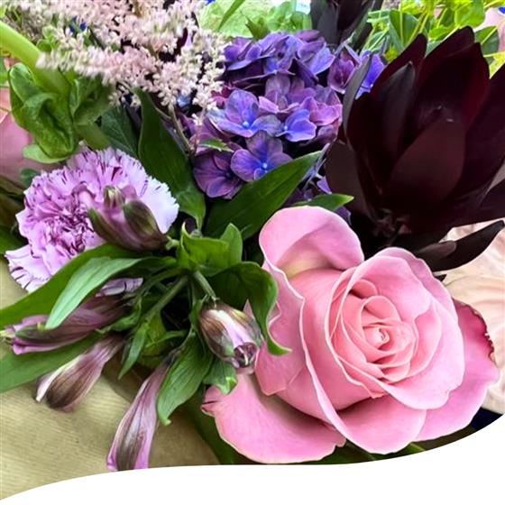 The bouquet is enhanced with Alstroemerias, Carnations, Safari Sunsets and more, creating a colourful arrangement. Adding depth to the bouquet are Pink Astilbe, Fountain Grass, Bupleurum, and Purple Hydrangeas, while Pink Hermosa Roses lend a touch of timeless elegance.