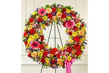 Golden roses, Pink and Red Gerberas, Red carnations and mixed spray chrysanthemums are beautifully arranged to form an elegant wreath accented wth lush and vibrant greens. Displayed on a wire easel, this stunning tribute is a wonderful symbol of eternal life.