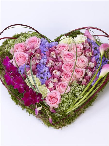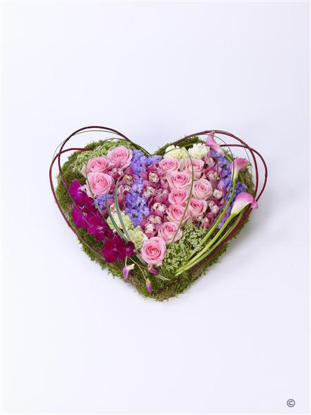 This heart-shaped design including large-headed roses, carnations and cymbidium and dendrobium orchids is given a contemporary feel with sweeping pink calla Lily, cornus and steel grass. Luxury choice will be a much larger heart in the same style.