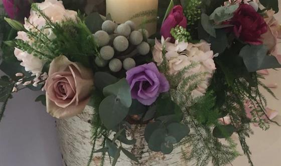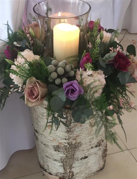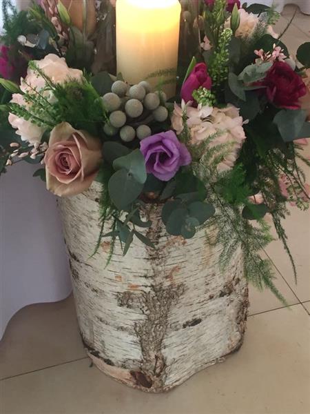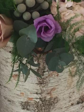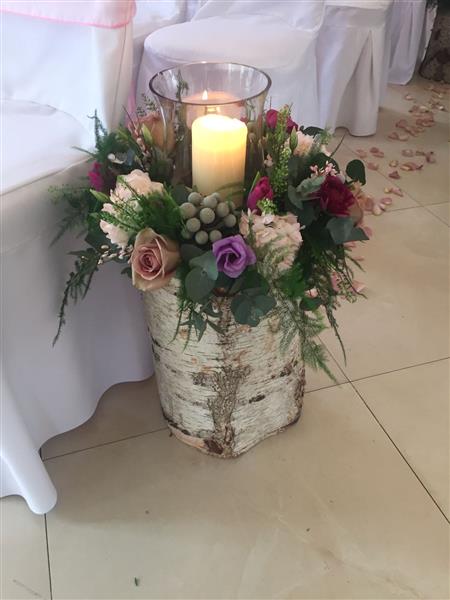 A lovely aisle arrangement made with Pale Pink, lilac and cerise flowers onto a Cork stand. Roses, Lisianthus, Hydrangeas, Tulips, Carnations, Mixed Foliage, Brunia and Thlaspi.