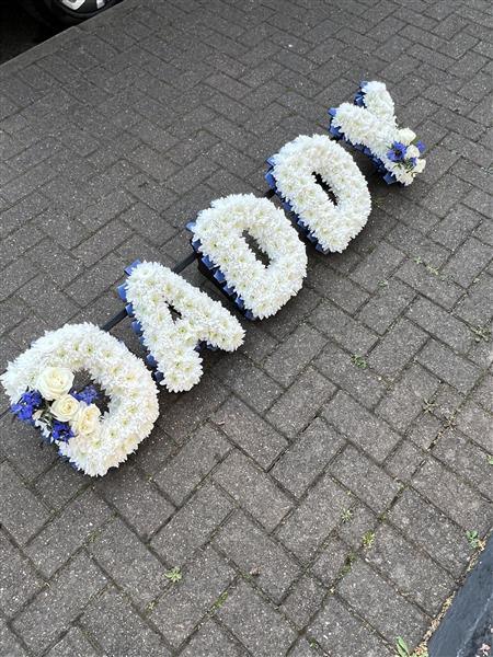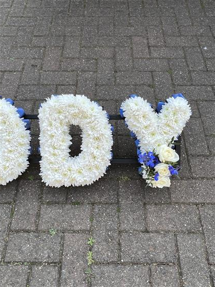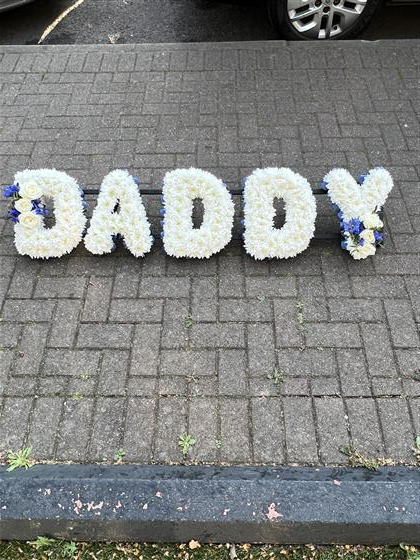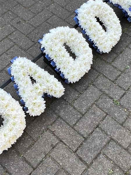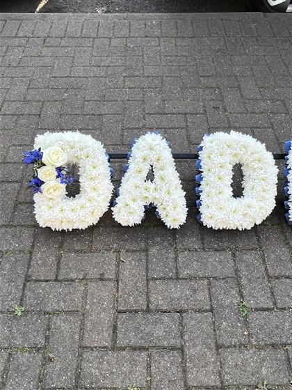 Daddy flower tribute with ribbon edge and a White base of Chrysanthemum. We will add a nice spray of flowers on each end.