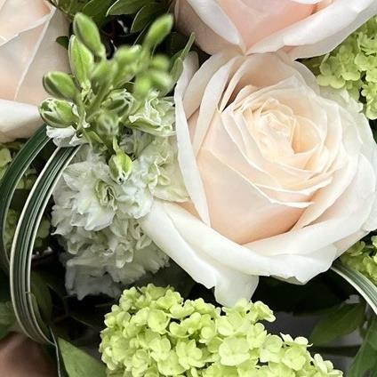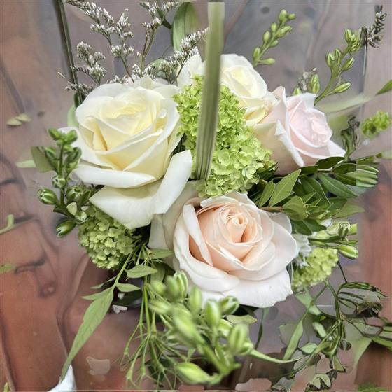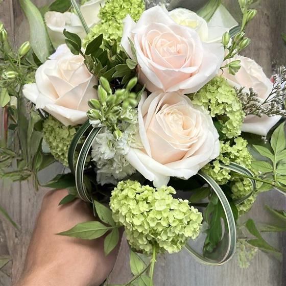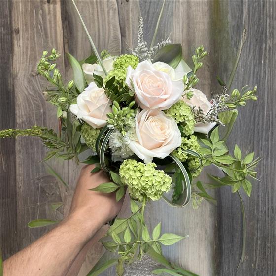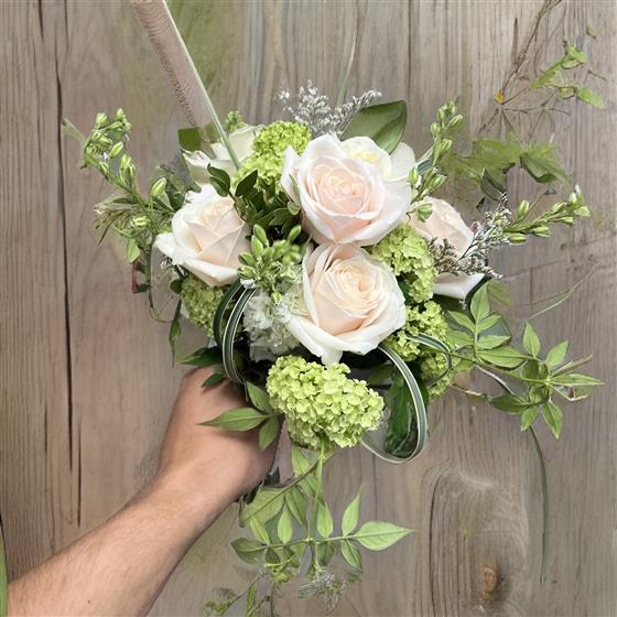 A small sized bridal or medium size bridesmaid bouquet made by our florist using Dorchester Roses, Green Viburnum, Jasmine, White Larkspur, White Limonium and variegated snake grass.