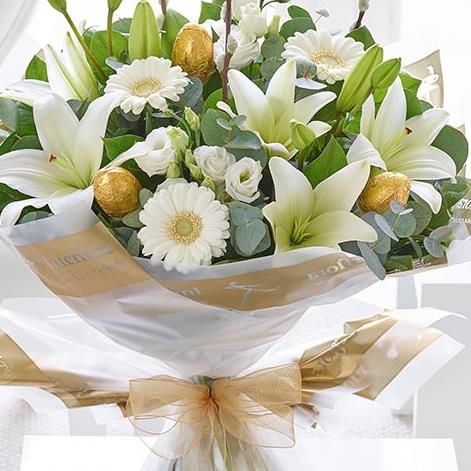 Featuring cream LA lilies, natural pussy willow, white germini and white lisianthus with eucalyptus, salal and foil-covered chocolate Easter eggs, wrapped and presented in Interflora Gift Packaging.