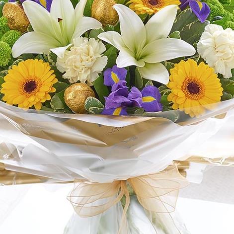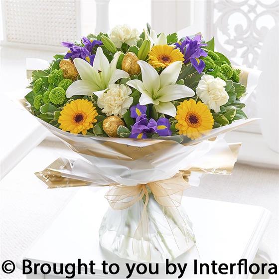 Featuring green spray chrysanthemums, yellow germini, blue iris, a cream LA lily and cream carnations with salal, pittosporum and foil-covered chocolate Easter eggs, wrapped and presented in Interflora Gift Packaging.