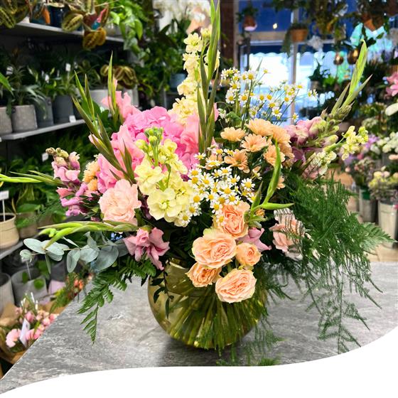 Behold the stunning Elegant Garden Vase Arrangement, featuring a vibrant mix of garden flowers carefully selected for their beauty and freshness. The arrangement includes Hydrangeas, Snapdragons, Chrysanthemums, Roses, Daisies, and lush green foliage, all nestled in a sleek, clear globe vase. Our dedicated team ensures exceptional customer service from order to delivery.