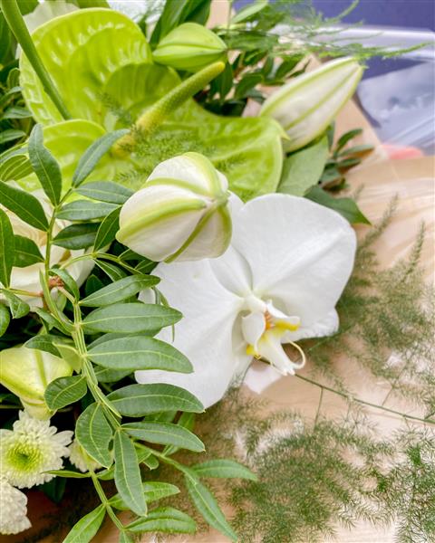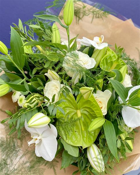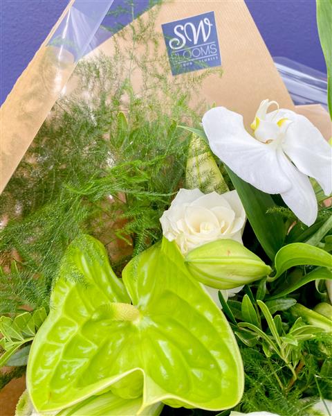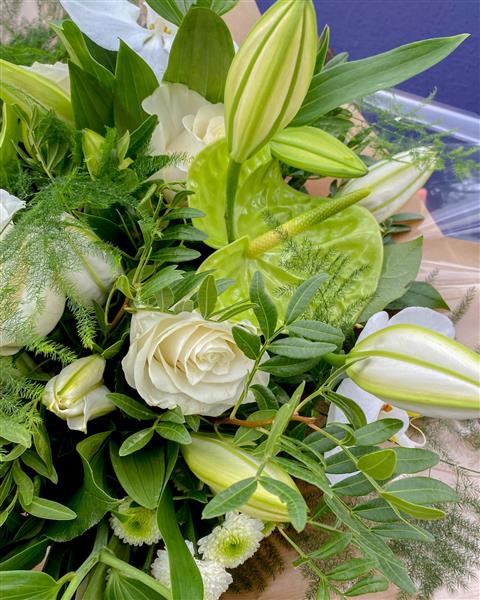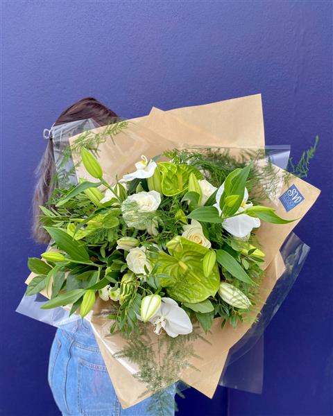 Our Elegant Greenery Delight is that perfect touch of nature's elegance. This lush arrangement features a stunning mix of white Lilies, Garden Roses and stunning green Anthuriums, perfectly complemented by an array of verdant foliage. Designed by our expert florists, this bouquet exudes sophistication and tranquility, making it the ideal choice for any occasion.