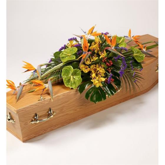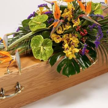 This Casket Spray features a selection of exotic flowers including the beautiful and elegant Birds of Paradise -Strelitzias, Green Anthuriums and Yellow Cymbidium Orchids complimented by luxurious foliages including large Monstera leaves and Hypericum berries.