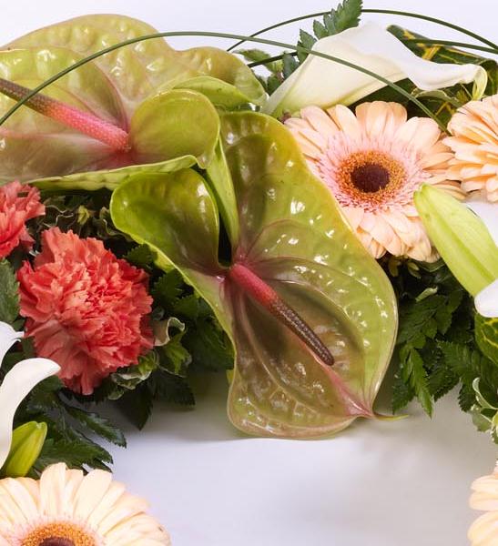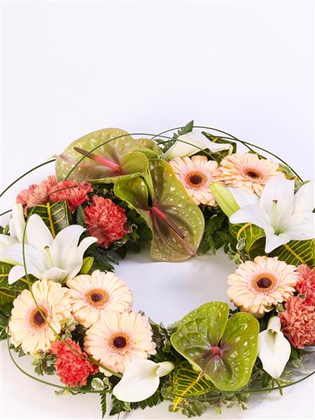 An elegant wreath featuring an exotic mix of anthuriums, calla Lily, Gerbera, Lily and carnations in green, orange and white. Tropical foliage and looped steel grass give it a contemporary feel. Approximate diameter 50cm (19 inches).