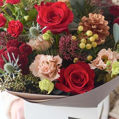 A beautiful bouquet of fresh festive flowers carefully chosen and arranged by a talented local florist.