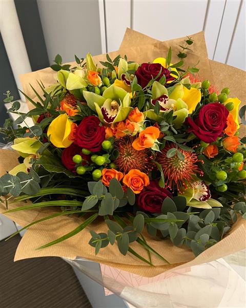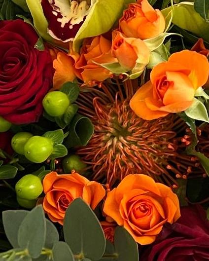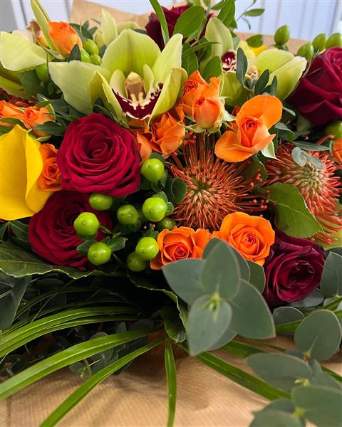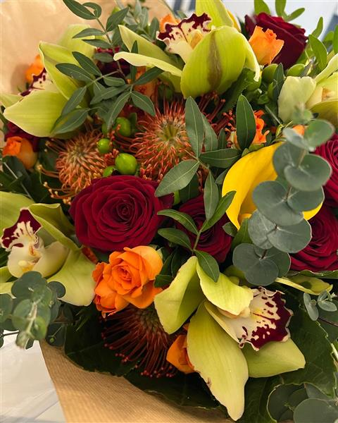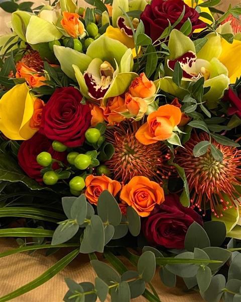 Beautiful hand tied bouquet of green Cymbidium Orchids, orange spray Roses, red Leucospurnums, and yellow Calla lilies, red roses, Green Hypericum berries with a mix of eucalyptus palm leaves and Ruscus.