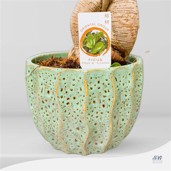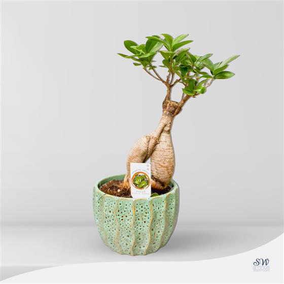 Introducing our Ficus Bonsai, a symbol of tranquility and natural beauty meticulously cultivated for your space. This miniature marvel, adorned with gracefully shaped leaves and an intricate trunk, effortlessly brings the essence of the outdoors into your living space. With its enduring charm and low-maintenance nature, the Ficus Bonsai transcends being merely a plant; it's a living work of art that infuses a sense of peace and coziness into any environment. Elevate your space with the captivating allure of our Ficus Bonsai – a timeless embodiment of harmony and serenity, presented in a charming green pot.