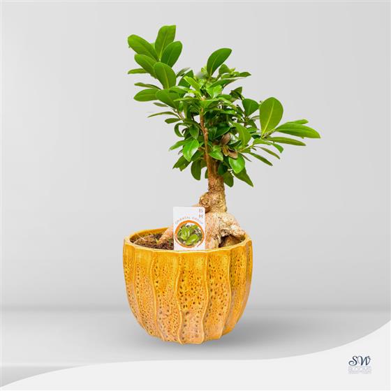 Introducing our Ficus Bonsai, a symbol of tranquility and natural beauty meticulously cultivated for your space. This miniature marvel, adorned with gracefully shaped leaves and an intricate trunk, effortlessly brings the essence of the outdoors into your living space. With its enduring charm and low-maintenance nature, the Ficus Bonsai transcends being merely a plant; it's a living work of art that infuses a sense of peace and coziness into any environment. Elevate your space with the captivating allure of our Ficus Bonsai – a timeless embodiment of harmony and serenity, presented in a charming yellow pot.