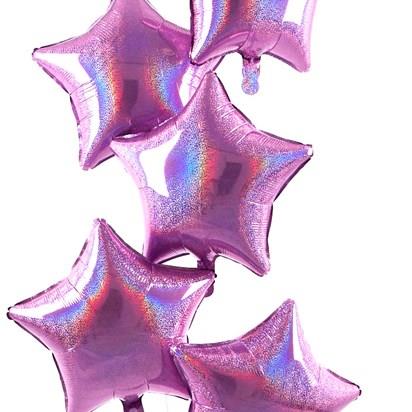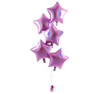 This eye-catching Pink Star balloon bouquet is radiant with an array of Pink metallic colours – just right for getting into the party mood. The Star 45cm micro-foil balloons arrive filled with helium and tied to a weight with curling ribbon decorations.