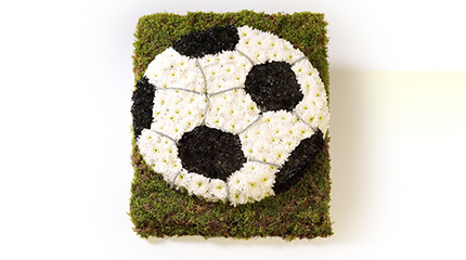 This football themed floral tribute is a very fitting choice for football fans, young and old. Carefully hand-made with an array of white double spray chrysanthemums, the football design is created with silver cord and black floral spray and is edged with green moss.