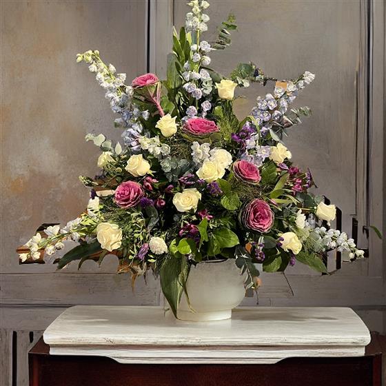 A beautiful arrangement made to face forwards only so it can go against a wall.