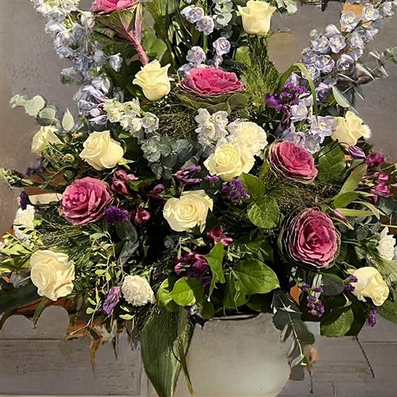 We will use a selection of Roses, Delphiniums, Cabbages, Phlox, Statice, Lisianthus and Alstromerias.