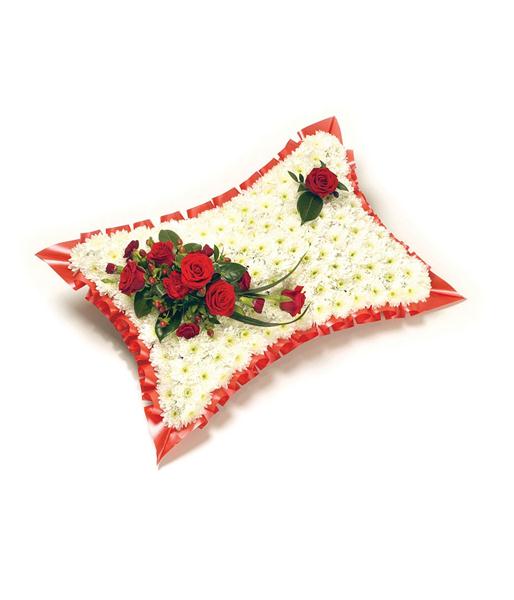 A classic white Chrysanthemum based pillow with ribbon edge. Featuring Roses, Carnations, Hypericum and complementary foliage.
