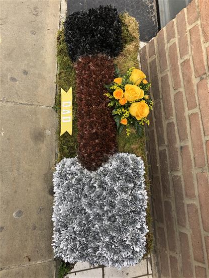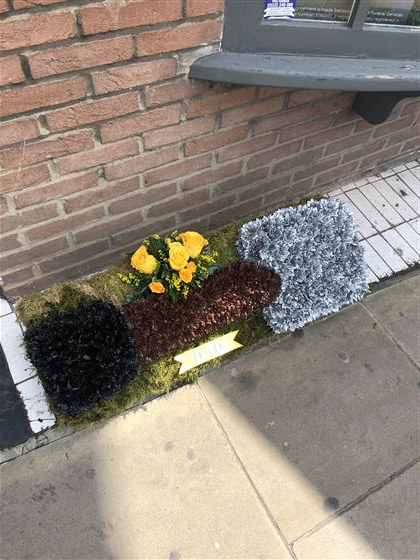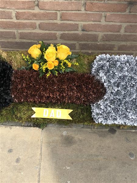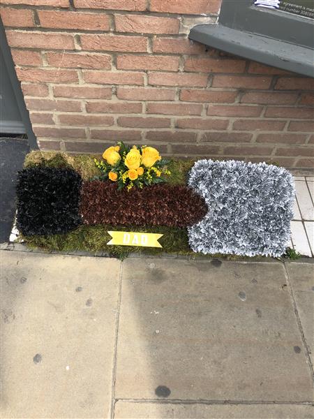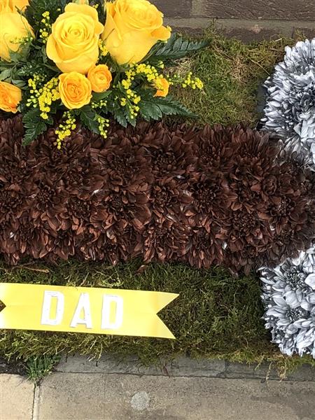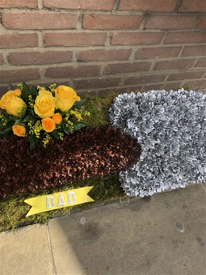 A garden Spade flower tribute made perfectly to fit down the side of a hearse. We can match the ribbon and flowers in any colour.