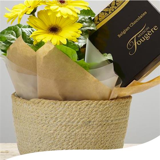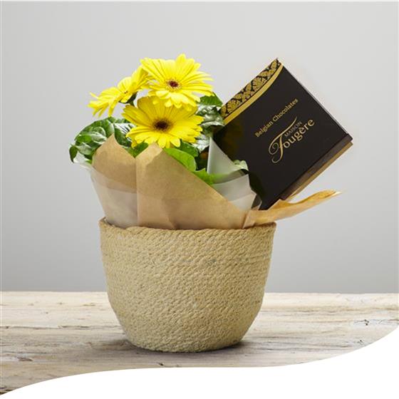 Treat yourself or someone special with our vibrant Gerbera Planted Basket with Chocolates! These lovely yellow Gerbera daisies are already potted and guaranteed to bring the grace of sunshine into any room. As an extra delight, this basket includes a delectable selection of chocolates.