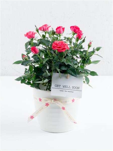 Featuring a pink flowering rose plant in a white ceramic pot with a ‘Get Well’ pick and ribbon.