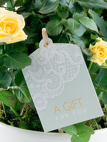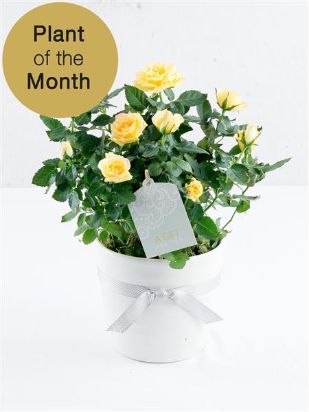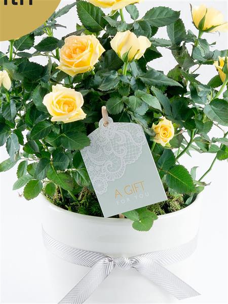 Featuring a yellow rose plant presented in a white ceramic pot, trimmed with a ribbon and gift tag.