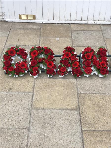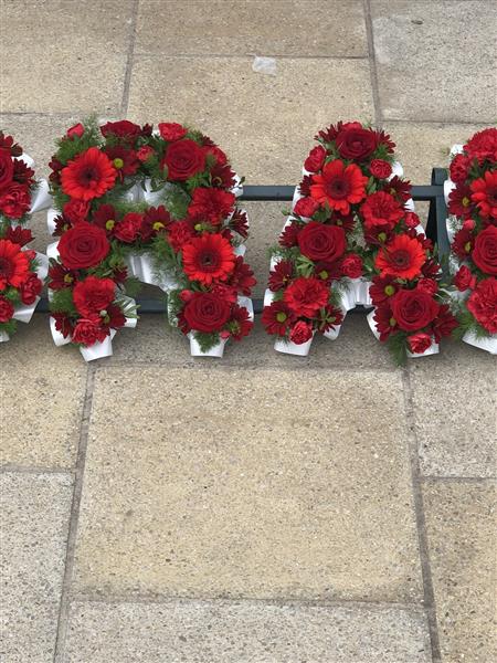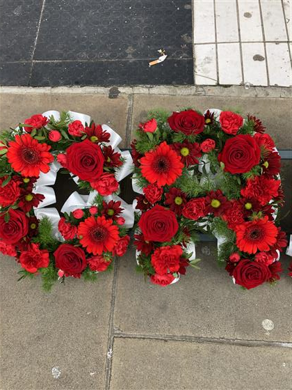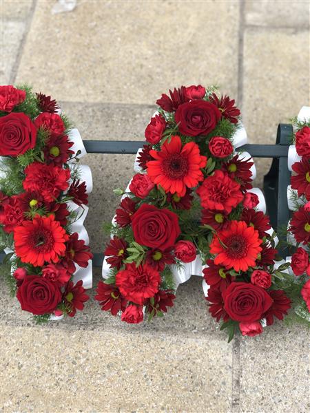 A GRAN tribute in mixed red flowers. Including Roses, Gerberas, Carnations and Spray Roses.