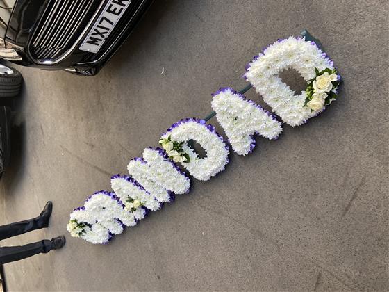 A Grandad Tribute - White Chrysanthemums, Purple Ribbon edge and White Rose Sprays.