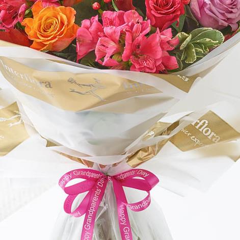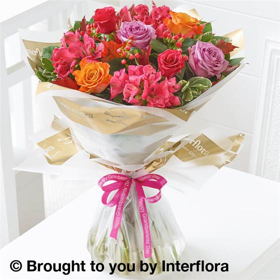 Featuring cerise alstroemeria, red spray hypericum, lilac large headed roses, orange medium headed roses and cerise medium headed roses with burgundy oak leaves, pittosporum and salal, wrapped and trimmed with ‘Happy Grandparents' Day’ ribbon and presented in a Interflora gift packaging.