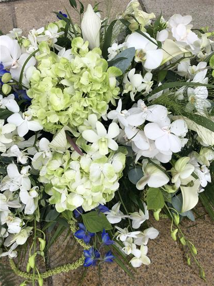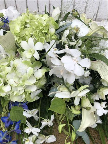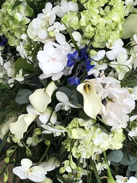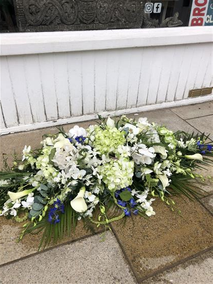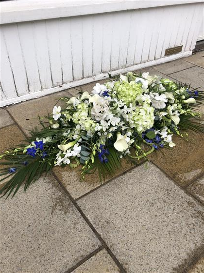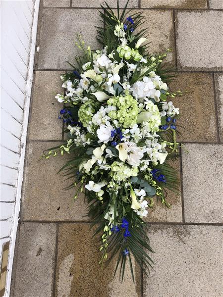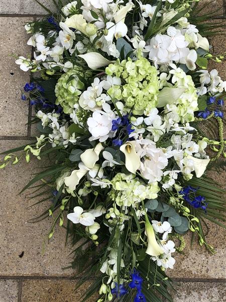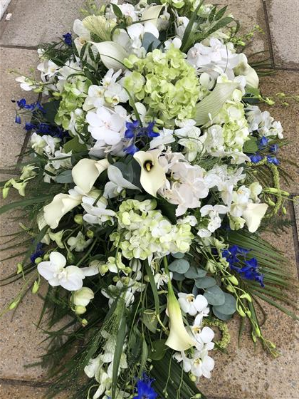 A beautiful coffin spray made with pale green Hydrangea, White Dendrobium Orchids, White Vandha Orchids, White Phalanopsis Orchids, Trailing Green Amaranthus, White Calla Lily’s, Blue Delphiniums and White and Green Anthiriums. A selection of choice foliage including Phoenix Palm leaves and Eucalytpus.