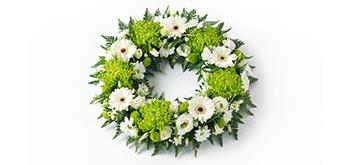 The lime green shamrock chrysanthemums in in this beautiful wreath look beautiful contrasted with cream germini and white lisianthus. This pretty wreath design is finished with leaves and grasses.