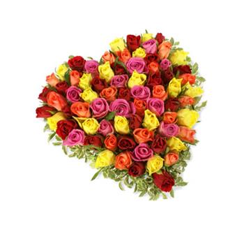 Heart tribute of Pink, Yellow, Red and Orange Roses. We will do a foliage edge around the heart and
