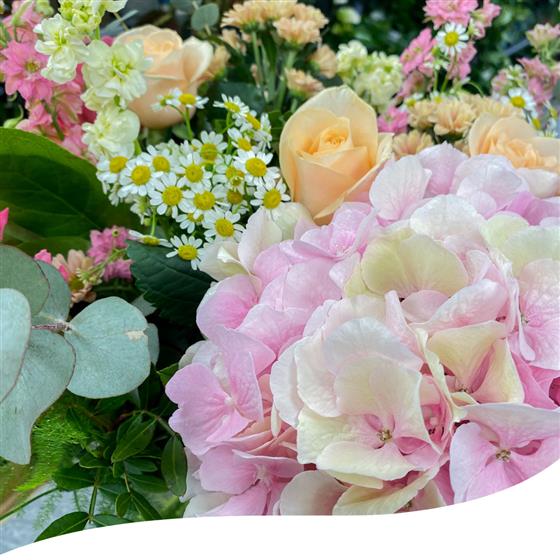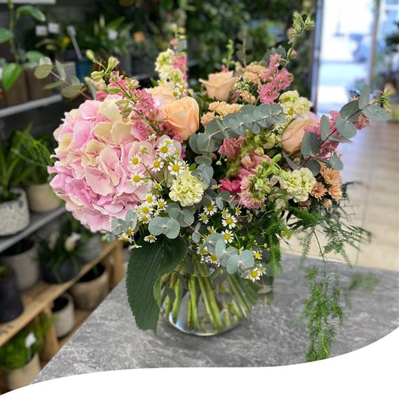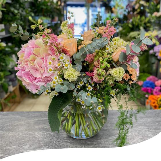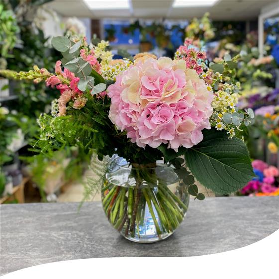 Our Hydrangea Garden Vase Arrangement is a slightly different version of our Elegant Garden Vase Arrangement. This stunning display features a vibrant mix of garden flowers, carefully selected for their beauty and freshness. The arrangement includes Hydrangeas, Chrysanthemums, Roses, Daisies, and other stunning summer flowers, as well as lush green foliage and Eucalyptus, all nestled in a sleek, clear globe vase.