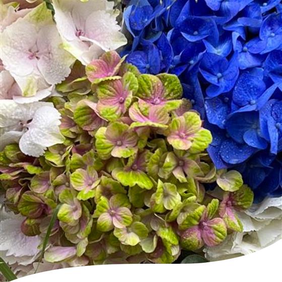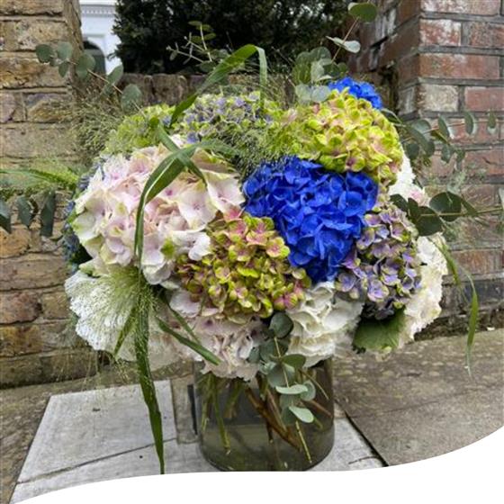 This stunning Hydrangea Harmony Vase Arrangement is created using a beautiful assortment of mixed-coloured Hydrangeas, complemented by Eucalyptus, Thlaspi Green Bell, and Panicum.