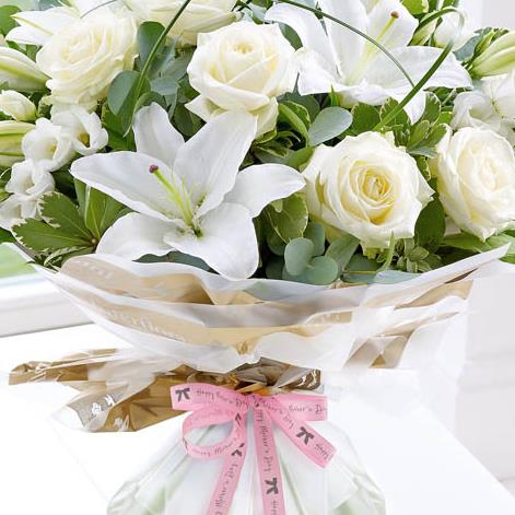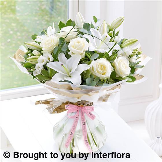 Featuring white large-headed roses, with white Oriental lilies and white lisianthus hand-tied with steel grass, salal, eucalyptus and pittosporum, wrapped and trimmed with 'Happy Mother's Day' ribbon and presented in Interflora Gift Packaging.