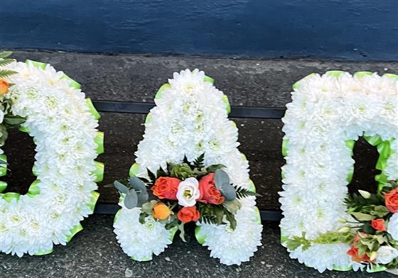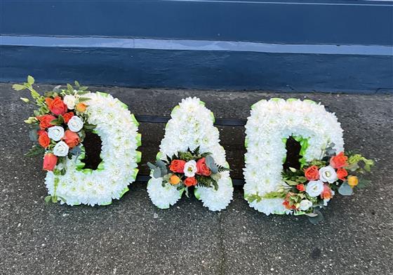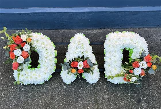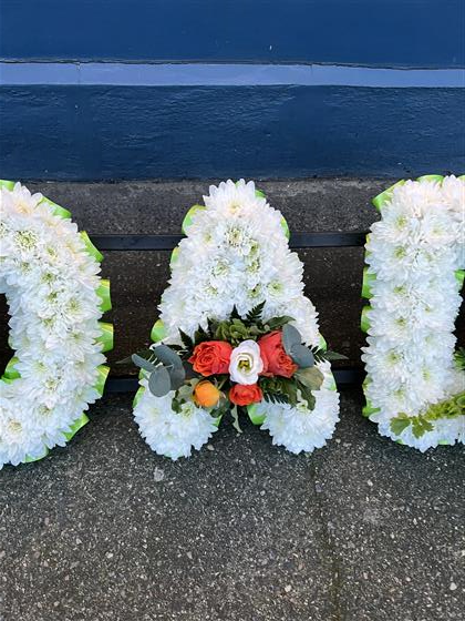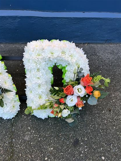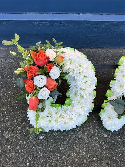Green Ribbon edge, White Chrysnathemum Base and then matching sprays on easvh letter with orange roses and some other flowers in green and white.