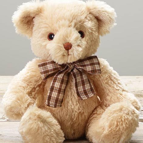 James Junior is an adorably fluffy baby safe bear in brown, with a coordinating ribbon bow around his neck.