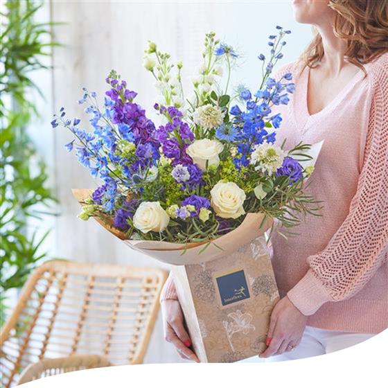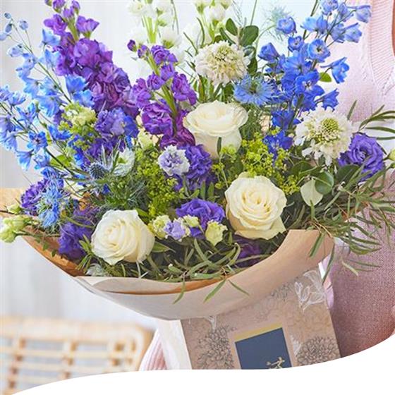 Celebrate July with our captivating Bouquet of the Month, a stunning arrangement that blends serene blues and crisp whites. Enjoy the elegance of Delphiniums, delicate Lisianthus, charming Sweet Williams, and more summer blooms, arranged to capture the essence of tranquil coastal vibes.