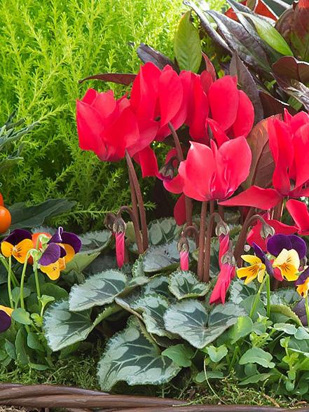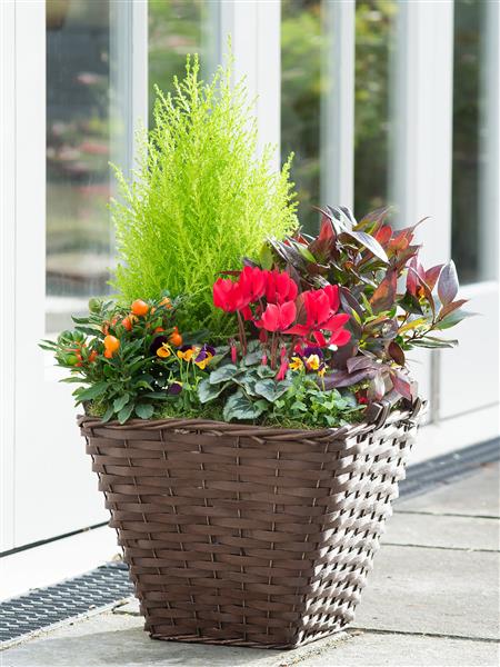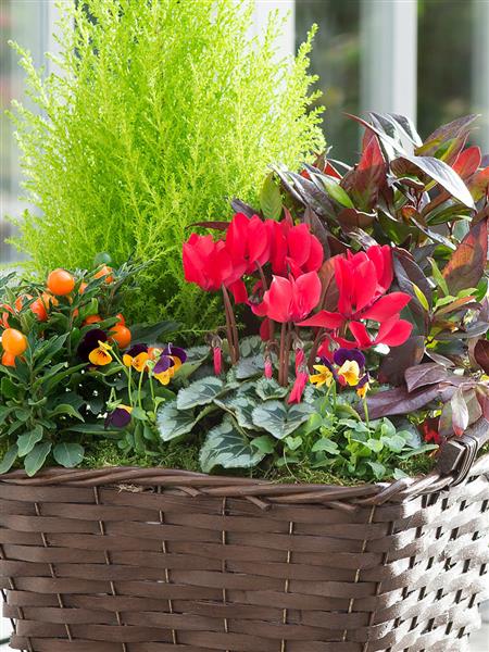 Featuring goldcrest, leucothoe, solanum, red cyclamen and orange violas, planted in a large outdoor basket.