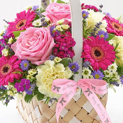 Featuring cream carnations, cream spray chrysanthemum, cerise germini, mixed sweet william, pink large-headed rose and blue September flower with pittosporum, salal, dried lavender and rosemary, presented in a two tone softwood basket trimmed with 'Happy Mother's Day' ribbon.