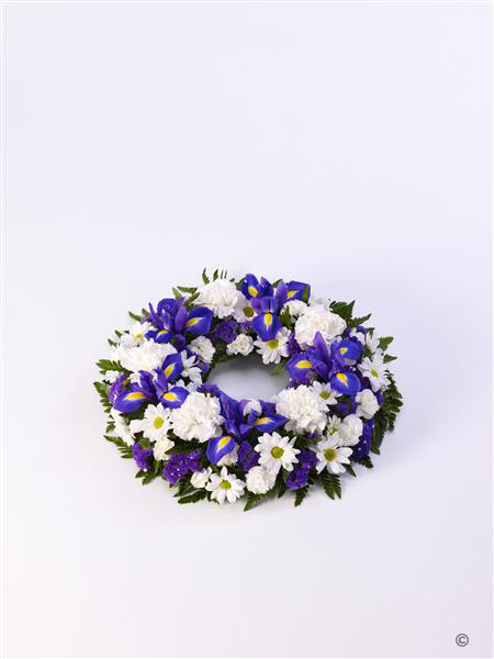 A classic selection of flowers including irises, carnations and spray chrysanthemums in blues and whites are nestled into this traditional circular wreath. Approximate diameter 44cm (17 inches).